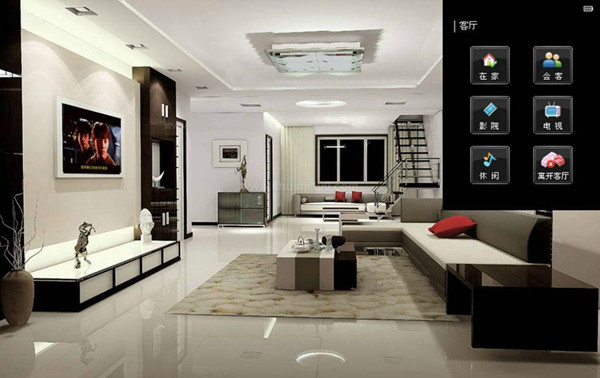 會(huì)客模式:按下場(chǎng)景面板上的“會(huì)客模式”按鍵,房間的燈光變亮了、電視機(jī)關(guān)閉、并響起了舒緩的背景音樂歡迎客人的到來。